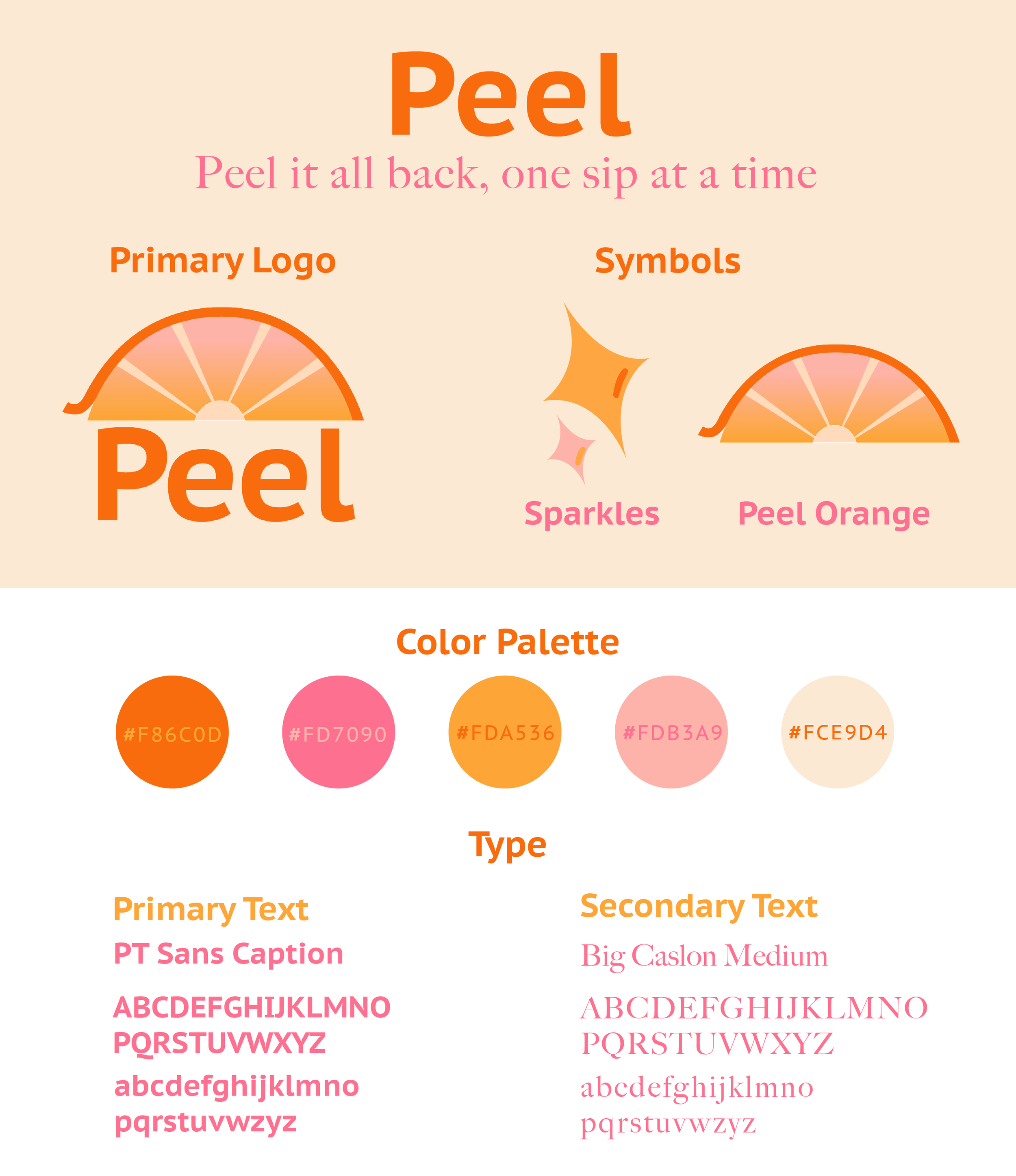 Logo:A peeling orange with a sunrise in the middle symbolizes the name of the brand and the targeted time to drink Peel.